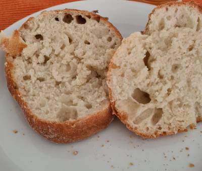 Backofen auf 230°C Ober-/Unterhitze aufheizen. Nach dem der Teig gezogen ist diesen nun einige Minuten aklimatisieren: Arbeitsplatte und den Teig bemehlen. Diesen nun auf die Arbeitfläche stürzen. Mit einen Spachtel/Teigkarte in 8 Stücke teilen. Die Teiglinge nun von den Ecken her nach oben schlagen und die „Naht“ etwas zusammen drücken. Die Brötchen auf ein Backpapier absetzen und mit Dampf auf ein Backstahl / Backstein absetzen und für 10 min. anbacken. Dann auf 210°C die Temperatur senken und weitere 10 Min., bis zur gewünschten bräune, fertig backen.