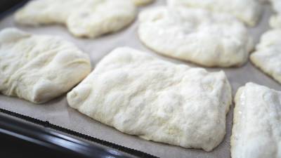 Die Arbeitsfläche bestauben und den Teig vorsichtig aus dem Becken gleiten lassen.Den Teig dann an zwei gegenüberliegenden Seiten mit beiden Händen ziehen und zur Mitte falten.Den Teig erneut bestauben und mit einer Teigkarte in 8 gleich große Stücke abstechen. Diese auf ein Backpaper oder bemehlten Tischplatte absetzen, mit einem Tuch bedecken und ein weiteres mal für 30 min. gehen lassen.