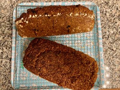 Die Brote nun auf der Seite liegend auf einem Rot auskühlen lassen. Vor dem Anschnitt sollten 12 Std. Vergangen sein. In dieser Zeit bildet das Mehl und die Körner eine saftige Krume.